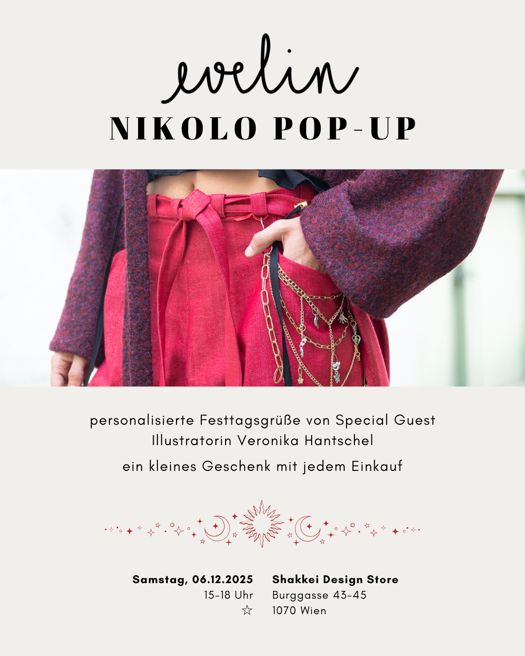 Zu jedem Einkauf von ihrem Label gibt es einen kleinen Gruß vom Nikolaus. Dich erwarten nachhaltige Einzelstücke und limitierte Serien made in Vienna und persönliche Beratung von mir persönlich. Also schau vorbei!
